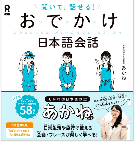 大人気YouTubeチャンネル「あかね的日本語教室」から、あかね先生の待望の会話本『聞いて、話せる!おでかけ日本語会話』がついに登場!
