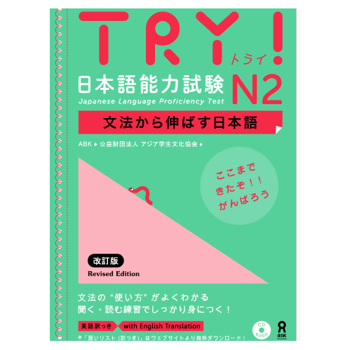 “TRY ! 日本語能力試験N2 文法から伸ばす日本語” is a widely trusted textbook created by the Asia Student Cultural Association (ABK). It is designed to help learners thoroughly master all JLPT N2 grammar points through realistic examples, contextual learning, and step-by-step practice.